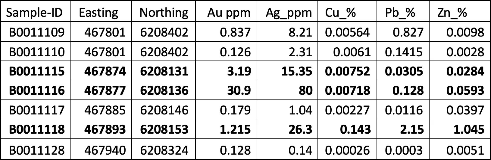 The following table shows the gold and silver values from the sericitic alteration zone that is up to 50 m wide.