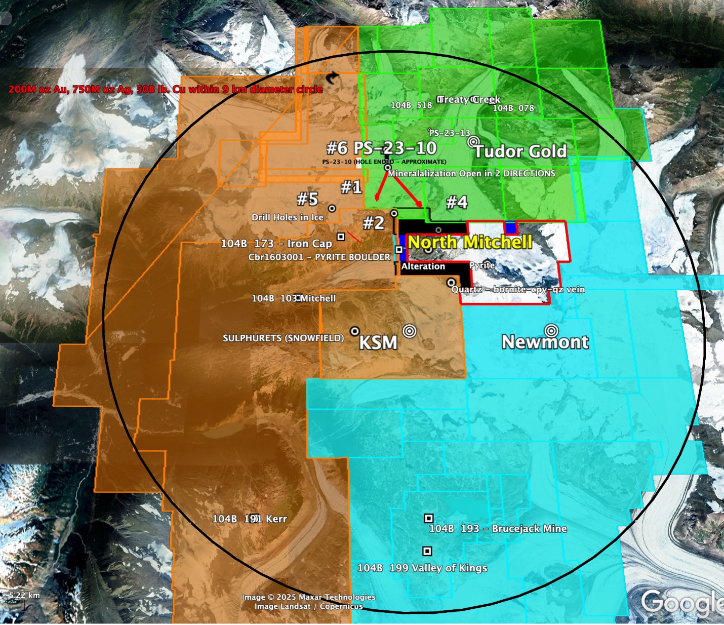- KSM’s Kerr, Sulphurets, Mitchell deposits, total a combined 88.3 million oz Au, located 8.8 km, 5.5 km & 3.6 km from North Mitchel respectively