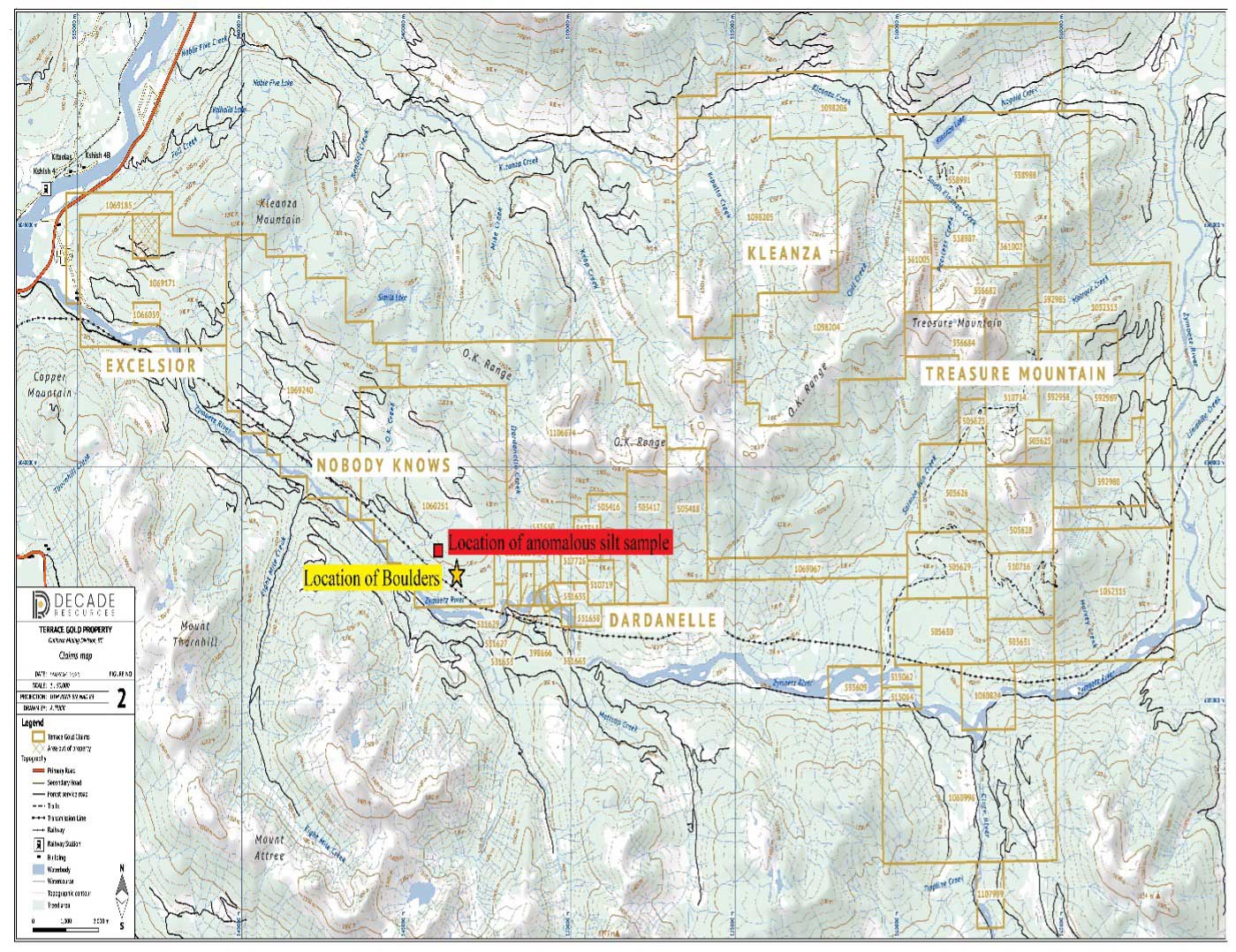 Stewart, BC – Decade Resources Ltd (“Decade” or the Company) is providing results of its exploration program on the Nobody Knows portion of the Company’s Copper River (Terrace) properties. The Copper River project consists of 59 contiguous minerals claims totaling 28,723.18 hectares formed by the Treasure Mountain, Dardanelle, Nobody Knows (6,870.79 ha) and Excelsior claims. It is underlain by a complex boundary zone between two prominent tectonic assemblages: the volcanic island-arc assemblage of the Stikinia Terrane in the east and the intrusive rocks of the Coast Plutonic Complex (Cretaceous-Tertiary?) to the west.