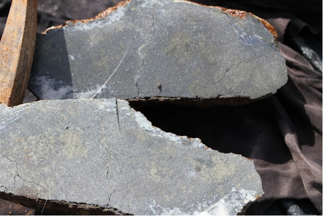 Photograph 2– Cut angular float sample showing abundant disseminated arsenopyrite as well as fractures with no weathering indicating recent excavation